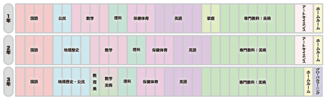 1年から3年まで、3年間を通してすべての生徒がデッサンの課題に取り組みます。デッサンは美術での制作活動の基礎であり、今後美術に携わる人になるうえで最も大切な力であると言えます。「ものを視る力」「本質を見極める力」「心の姿勢」「造形的な考え方」など、数えたらきりがないほど、さまざまな力を養う事ができます。