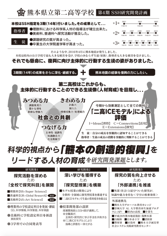 本校に設置されている理数科,美術科,普通科の3学科が協働しながら探究活動を行い,熊本地震の経験を科学的に捉えるとともに社会との共創を図りながら創造的復興に向け課題を発見し,豊かな感性を持って具体的な行動に移すことのできる生徒を育成する。